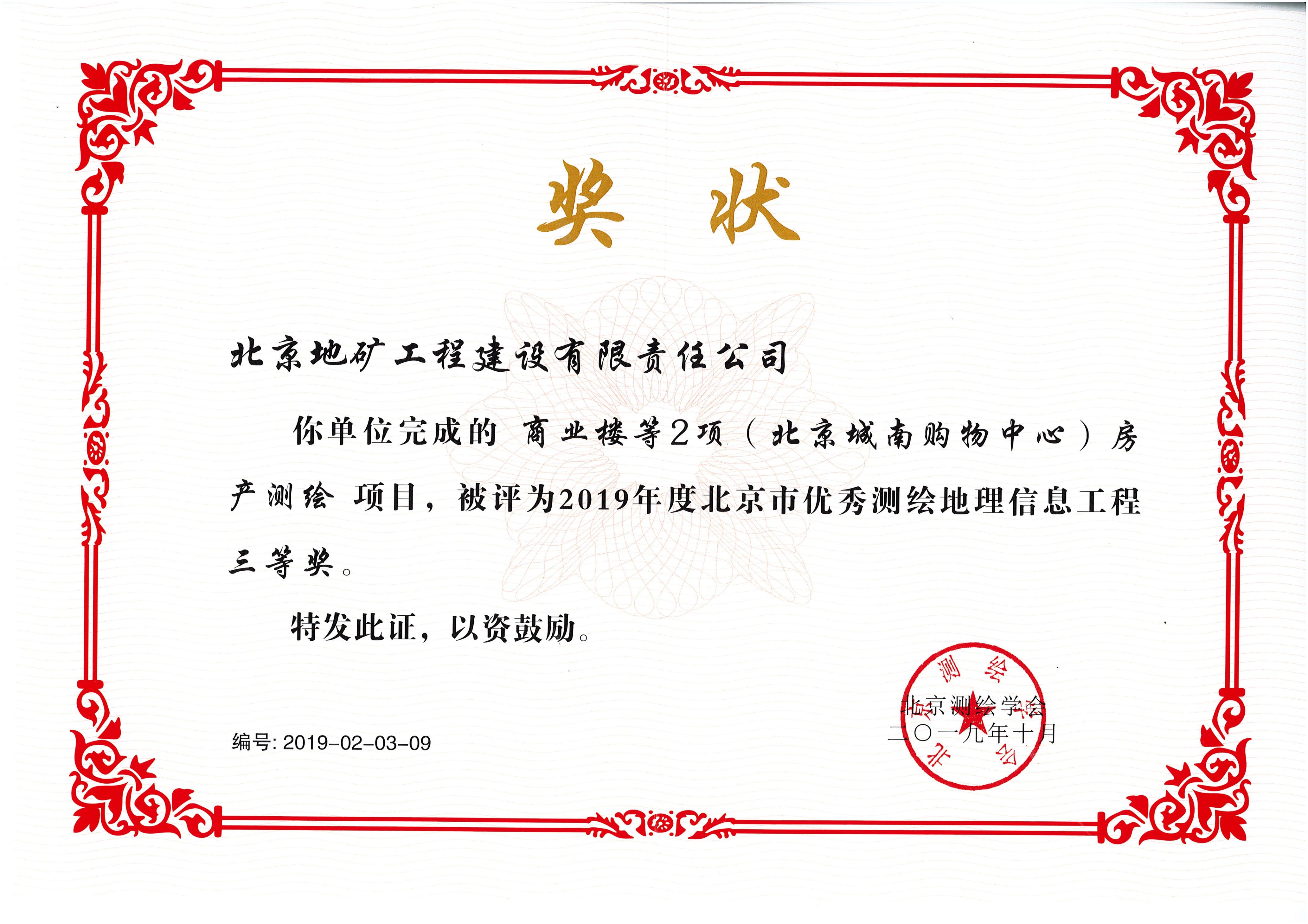 • 2019年北京城南購(gòu)物中心測(cè)繪獎(jiǎng)狀